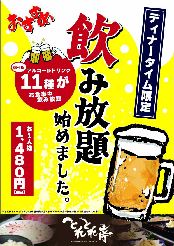 - 『とれとれ亭』【ディナー限定】アルコール飲み放題始めました
