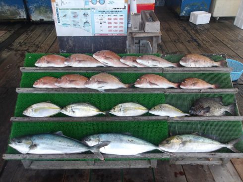 - ヒラマサ(2尾)カンパチ(1尾)シマアジ(4尾)タイ(16尾)イシガキ(1尾)