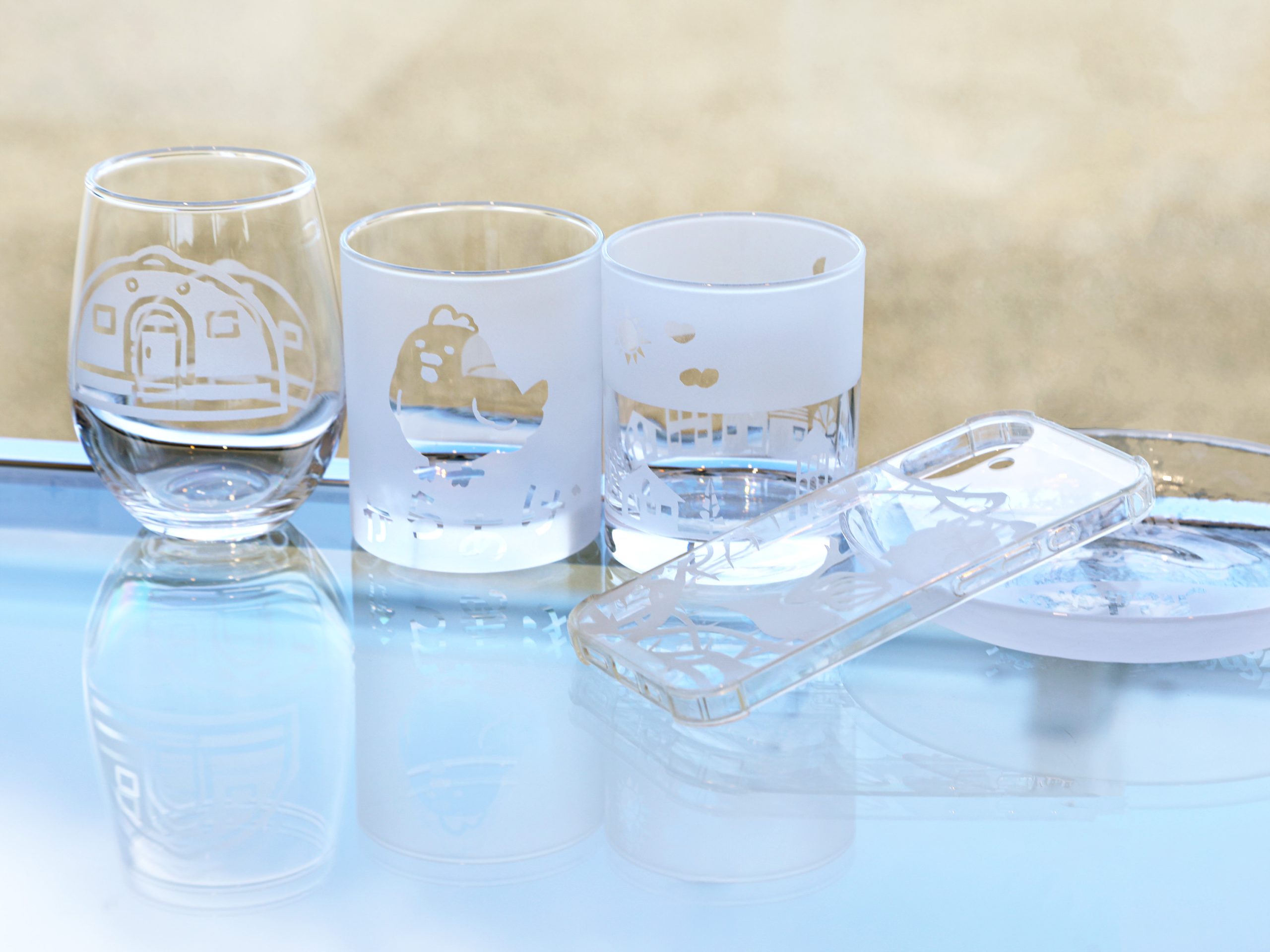 ・グッズに描くデザインを、シールに印刷して切り貼りをします。お客様自身でサンドブラストにて吹き付けをしていただきます。完成品はそのままお持ち帰りいただけます。